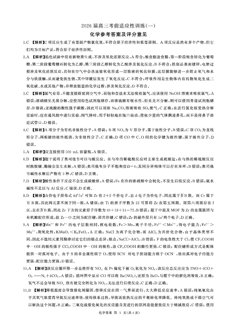 高三化学答案--百师联盟2026届高三考前适应性训练(一)