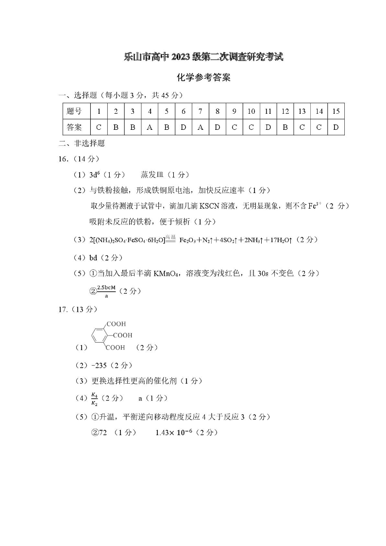 高三化学答案--四川省乐山市2026届高三第二次调查研究考试(乐山二诊)