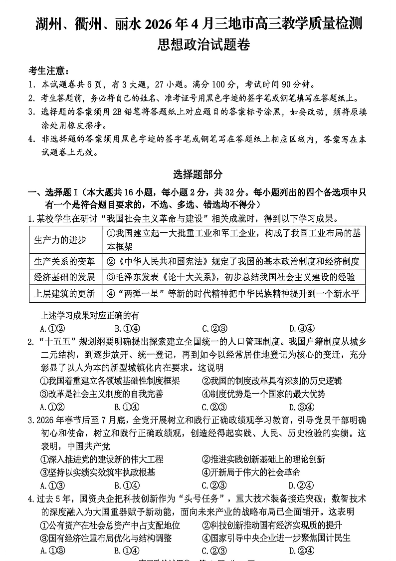 高三政治--浙江省湖州、衢州、丽水三地市2026届高三4月教学质量检测