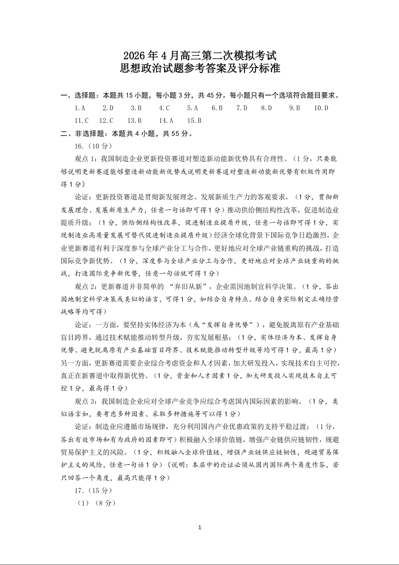 政治答案--山东省济南市2026届高三第二次模拟考试
