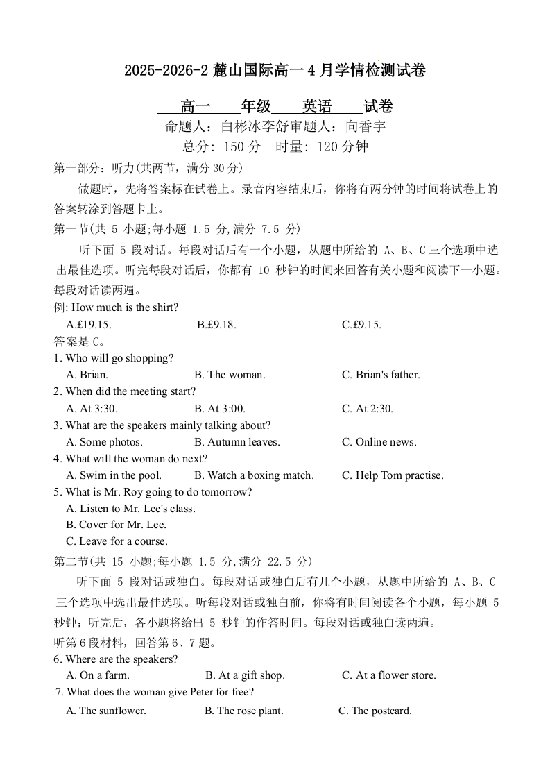 高一英语--湖南省长沙市麓山国际实验学校2025-2026学年高一下学期4月学情检测