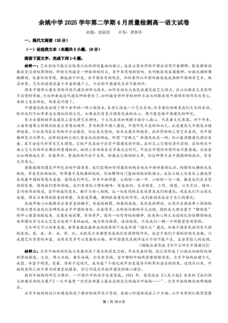 高一语文--浙江省余姚中学2025-2026学年高一下学期4月质量检测