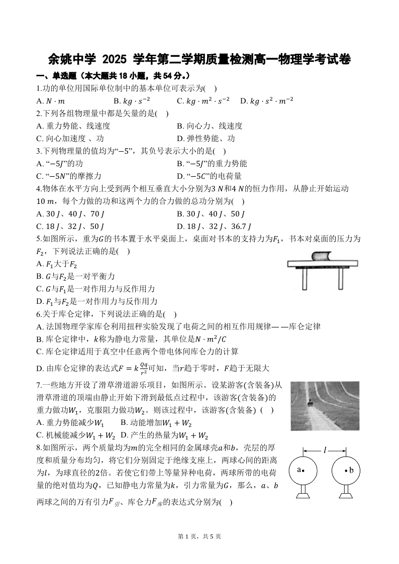 高一物理--浙江省余姚中学2025-2026学年高一下学期4月质量检测