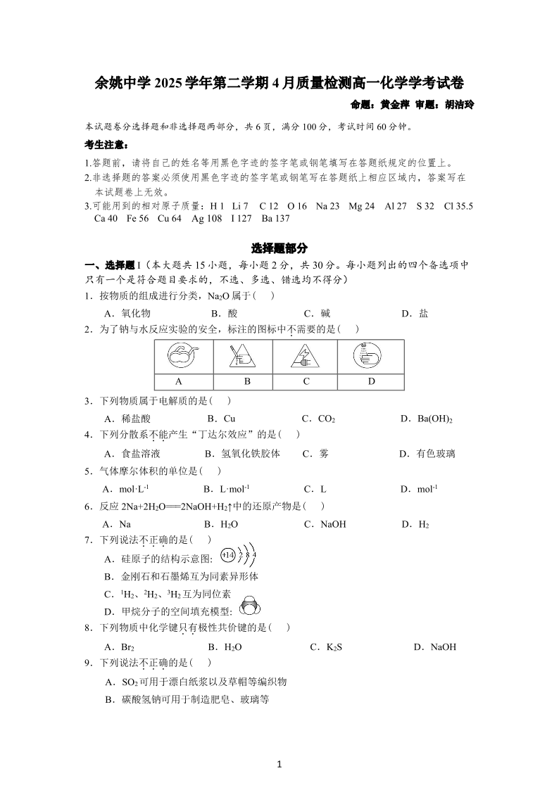 高一化学--浙江省余姚中学2025-2026学年高一下学期4月质量检测