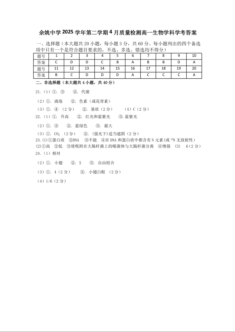 高一生物答案--浙江省余姚中学2025-2026学年高一下学期4月质量检测