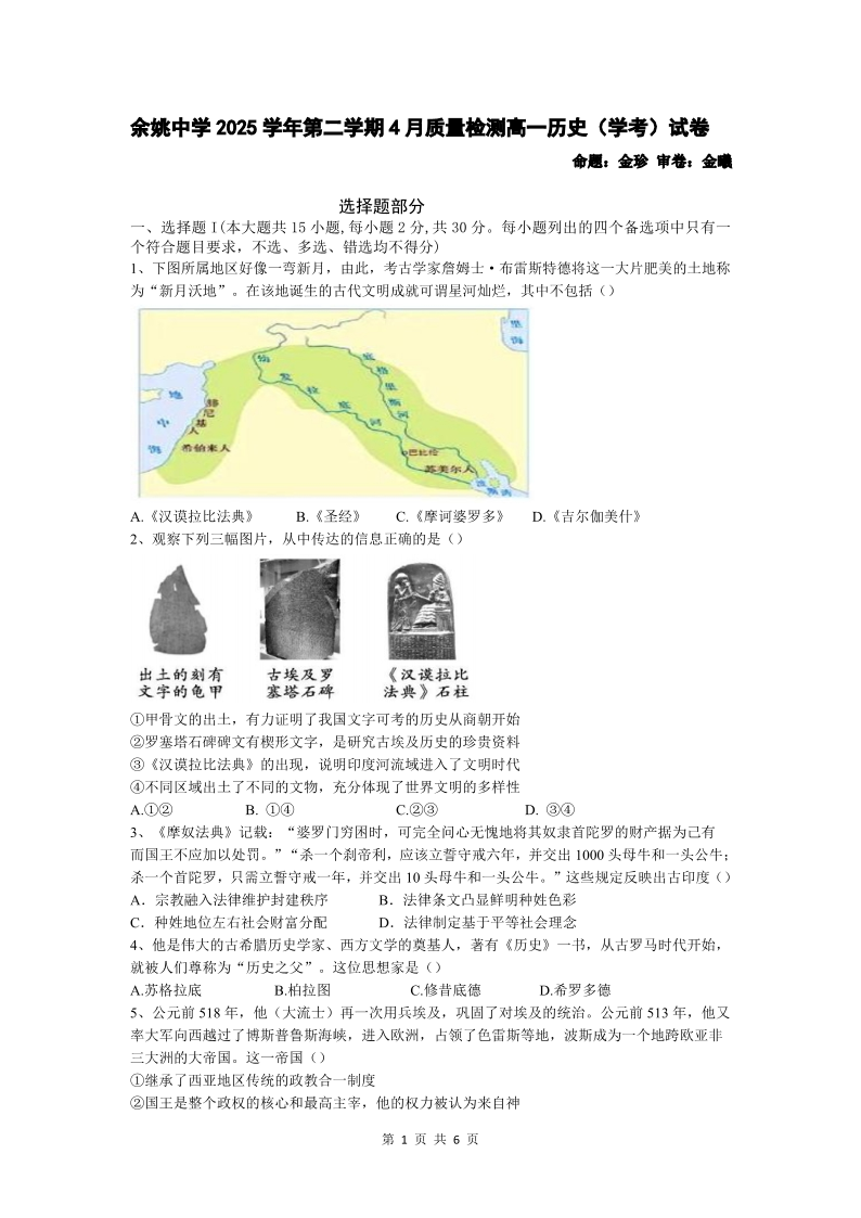 高一历史--浙江省余姚中学2025-2026学年高一下学期4月质量检测
