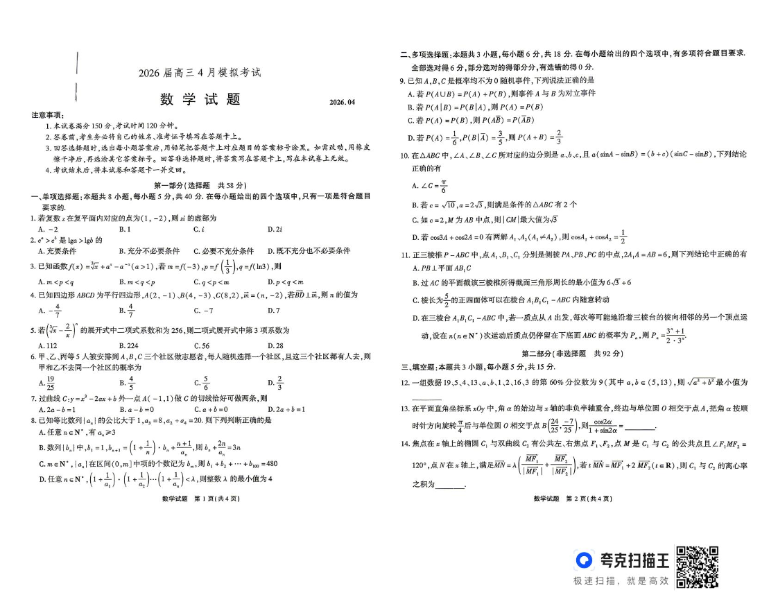 高三数学--安徽省江淮十校2026届高三下学期4月模拟考试(安庆市高三三模)