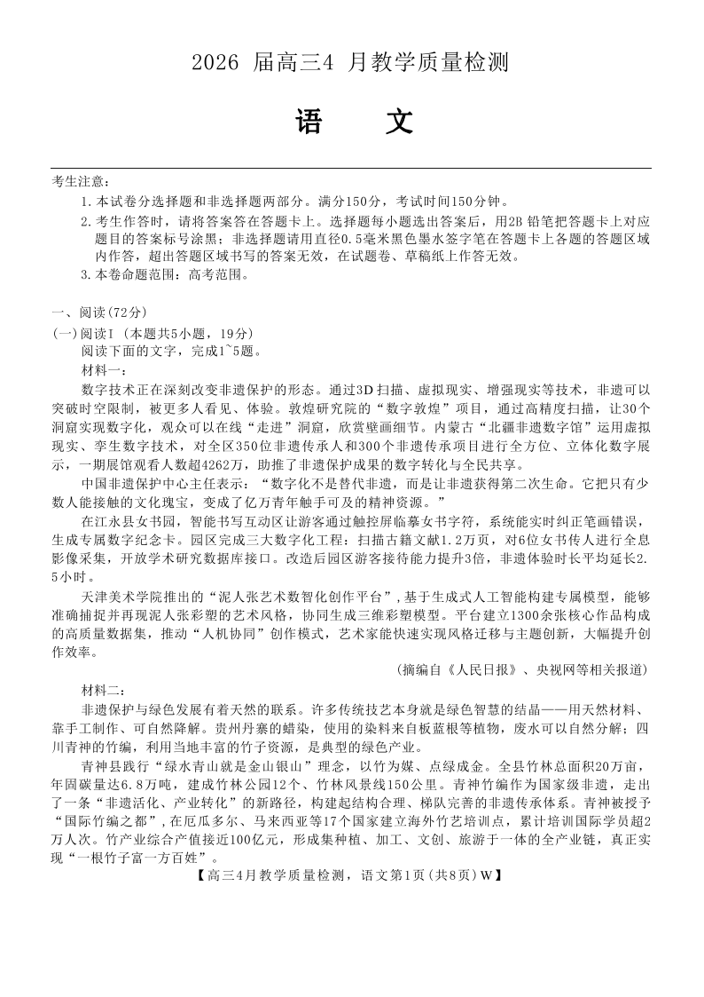 高三语文--安徽省皖南八校2026届高三下学期4月教学质量检测