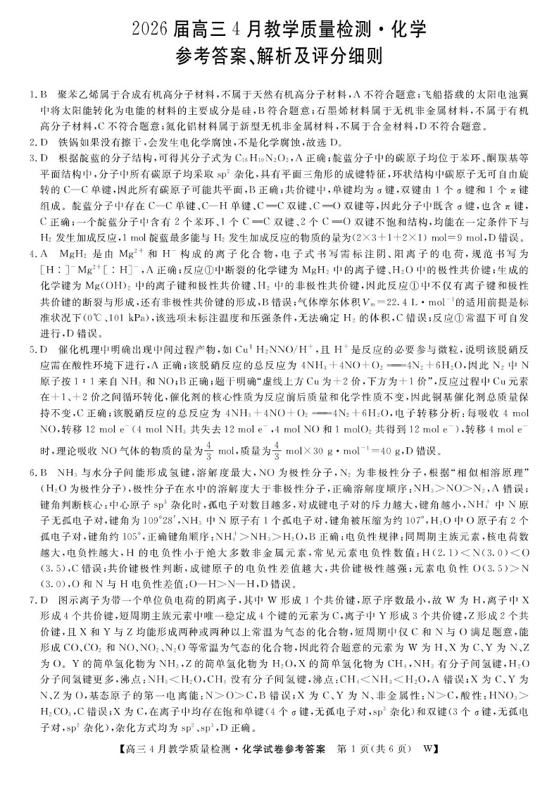 高三化学答案--安徽省皖南八校2026届高三下学期4月教学质量检测
