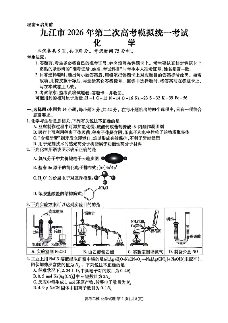 高三化学--江西省九江市2026届第二次高考模拟统一考试(九江二模)