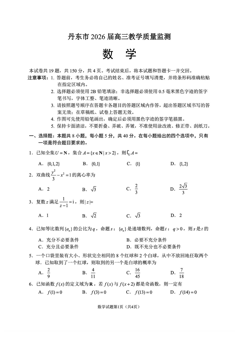 高三数学+答案--辽宁省丹东市2026届高三年级教学质量监测(丹东一模)