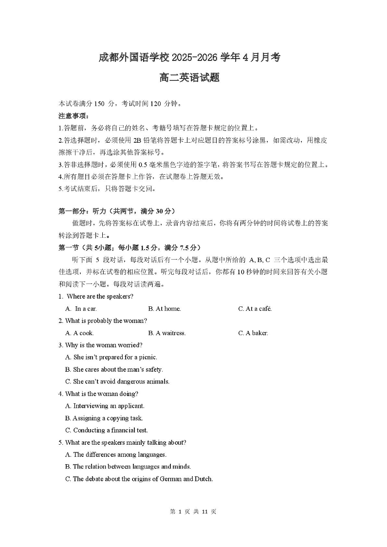 高二英语--四川省成都外国语学校2025-2026学年高二下学期4月月考
