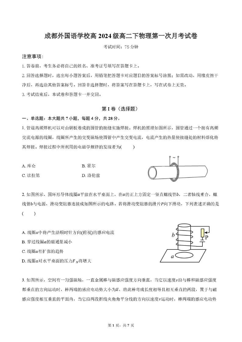 高二物理--四川省成都外国语学校2025-2026学年高二下学期4月月考