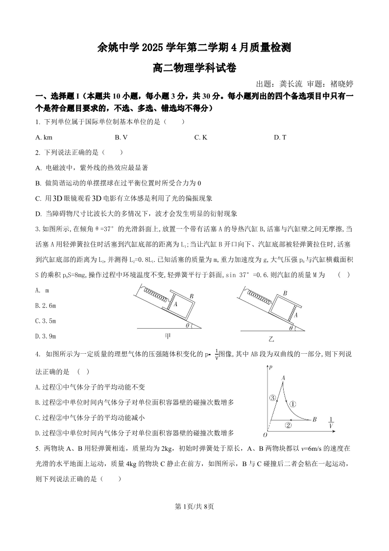 高二物理--浙江省余姚中学2025-2026学年高二下学期4月质量检测