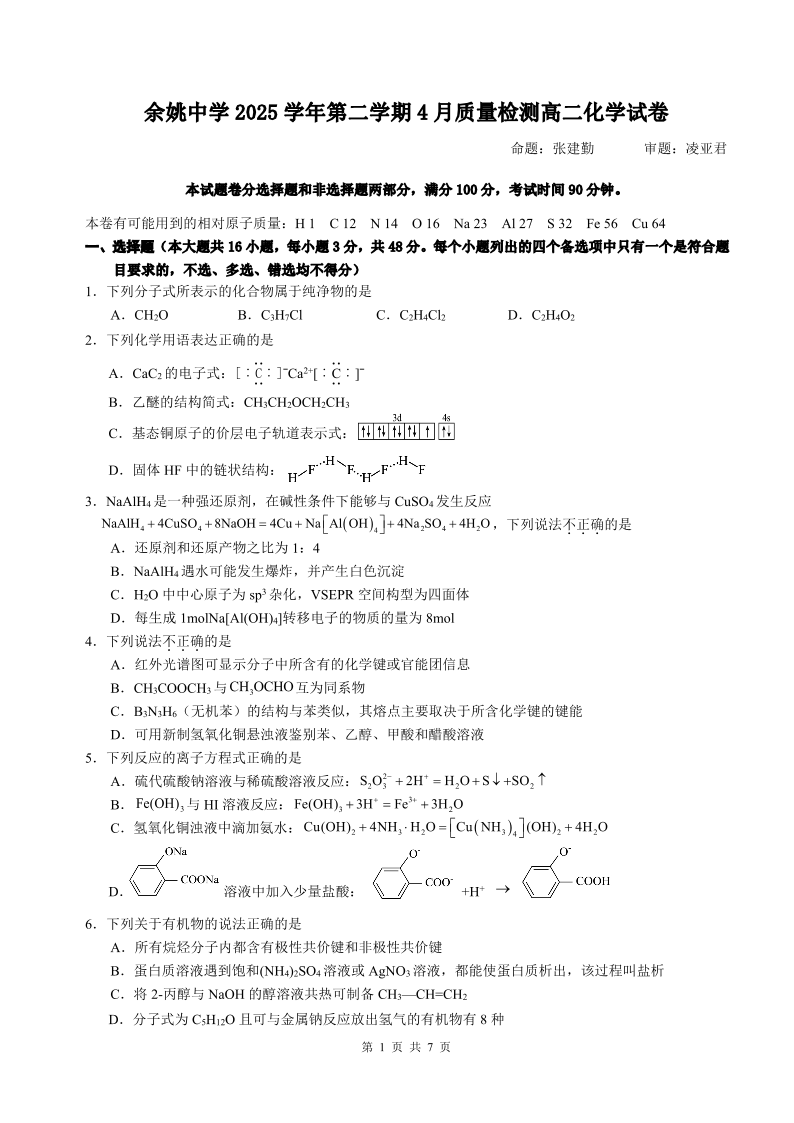 高二化学--浙江省余姚中学2025-2026学年高二下学期4月质量检测