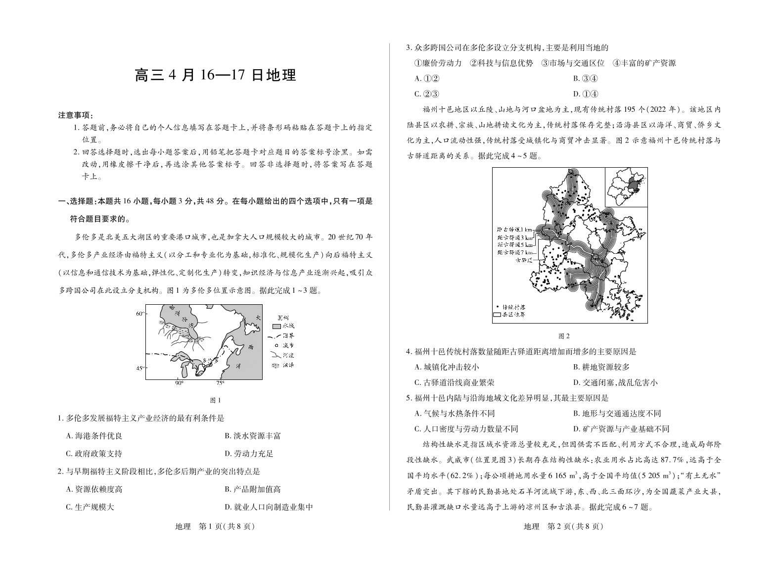 高三地理--安徽省合肥市第六中学等学校2026届高三4月联考