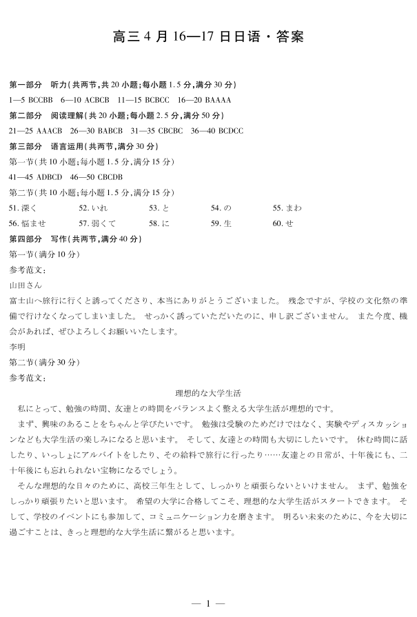高三日语答案--安徽省合肥市第六中学等学校2026届高三4月联考
