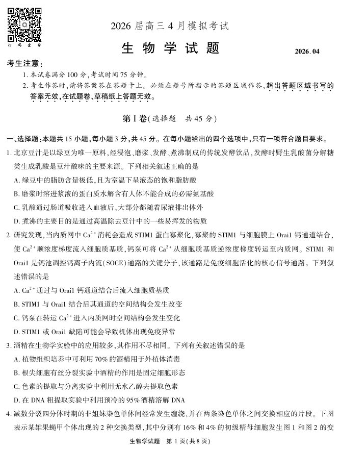 高三生物--安徽省江淮十校2026届高三下学期4月模拟考试(安庆市高三三模)