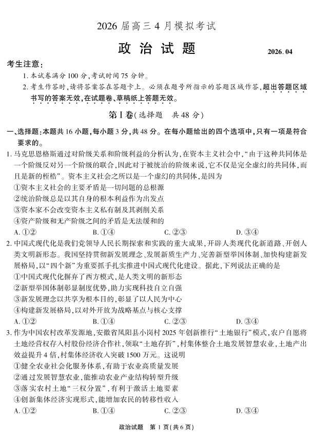 高三政治--安徽省江淮十校2026届高三下学期4月模拟考试(安庆市高三三模)
