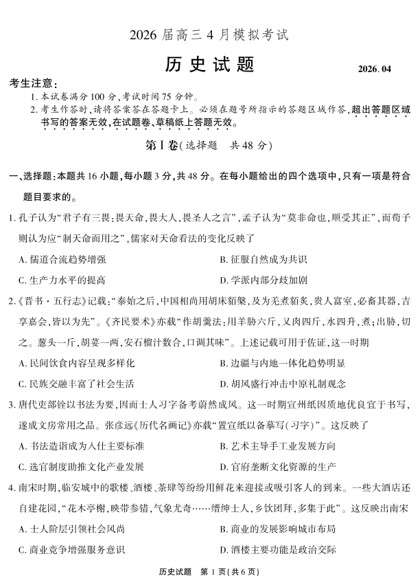 高三历史--安徽省江淮十校2026届高三下学期4月模拟考试(安庆市高三三模)