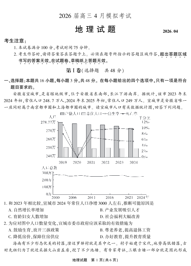 高三地理--安徽省江淮十校2026届高三下学期4月模拟考试(安庆市高三三模)