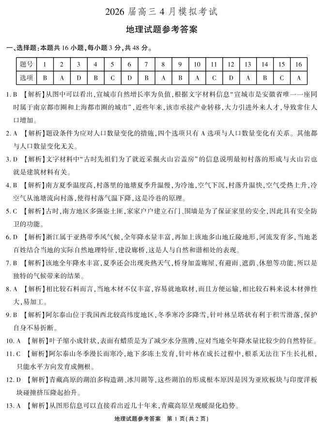 高三地理答案--安徽省江淮十校2026届高三下学期4月模拟考试(安庆市高三三模)