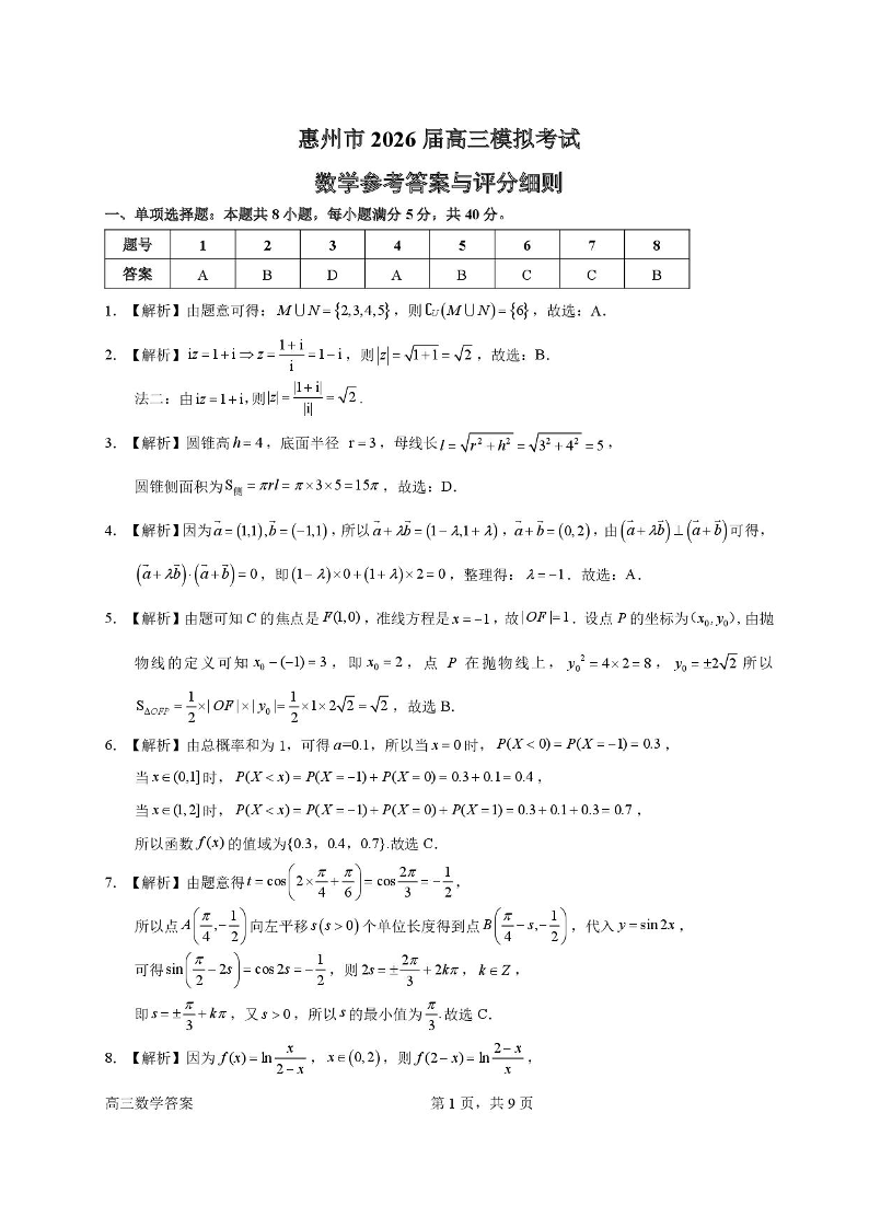 高三数学答案--广东省惠州市、韶关市2026届高三下学期4月模拟考试