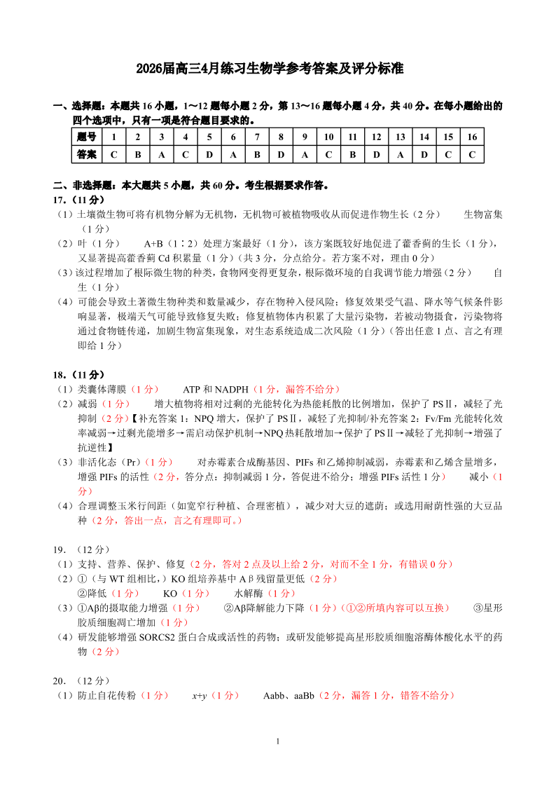 高三生物答案--广东省惠州市、韶关市2026届高三下学期4月模拟考试