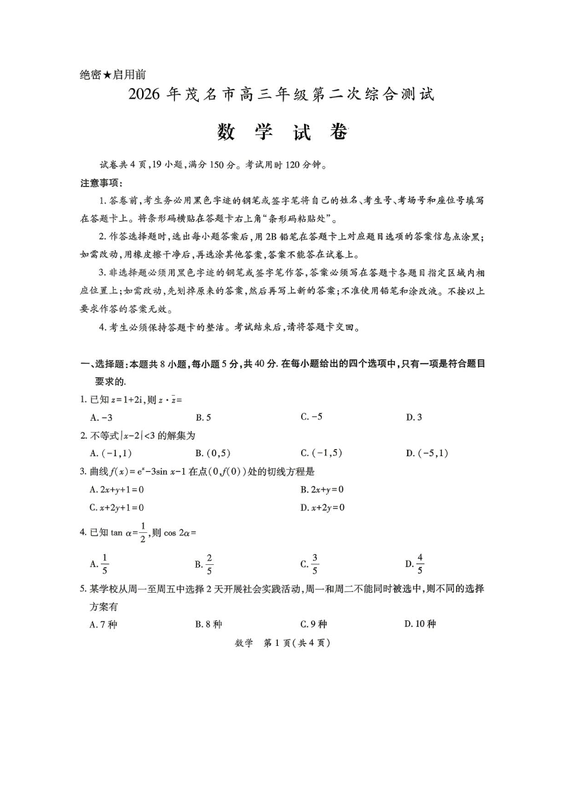 高三数学--广东省茂名市2026届高三第二次综合测试(茂名二模)