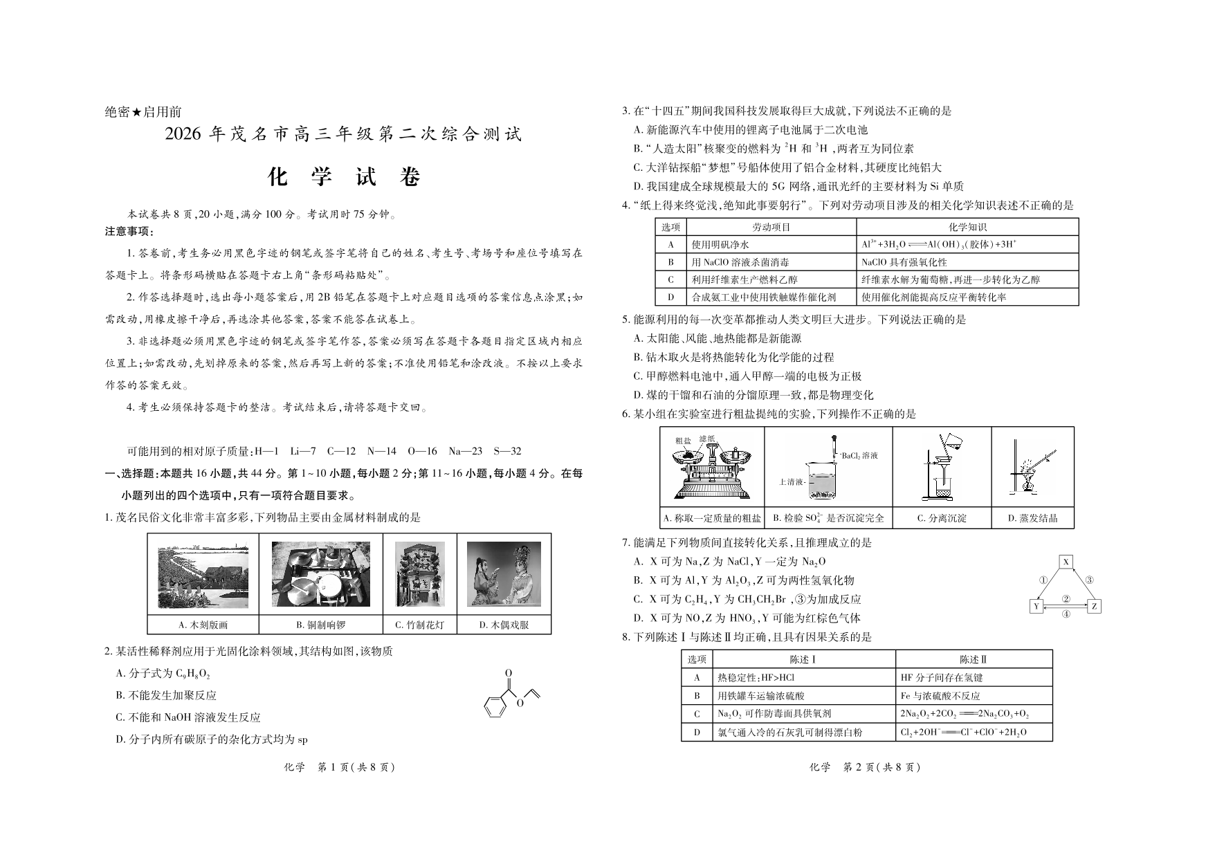 高三化学--广东省茂名市2026届高三第二次综合测试(茂名二模)