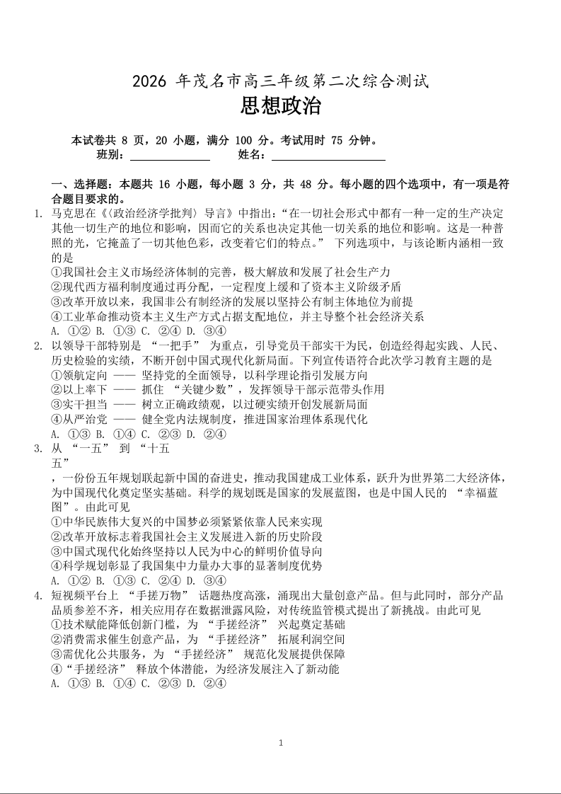 高三政治+答案--广东省茂名市2026届高三第二次综合测试(茂名二模)
