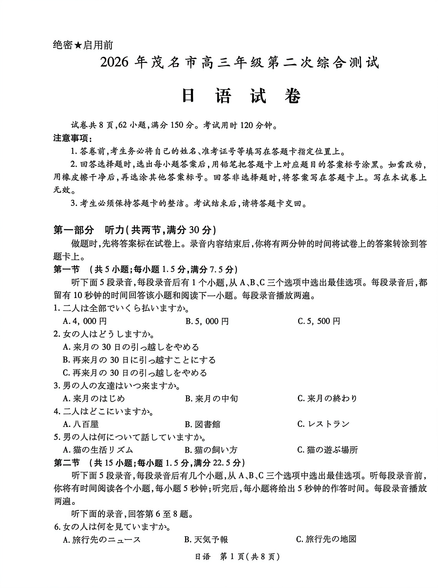 高三日语--广东省茂名市2026届高三第二次综合测试(茂名二模)