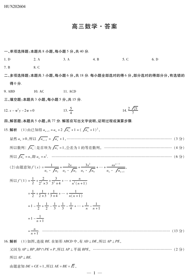 高三数学答案--湖南省、广西壮族自治区天一大联考2026届高三4月大联考