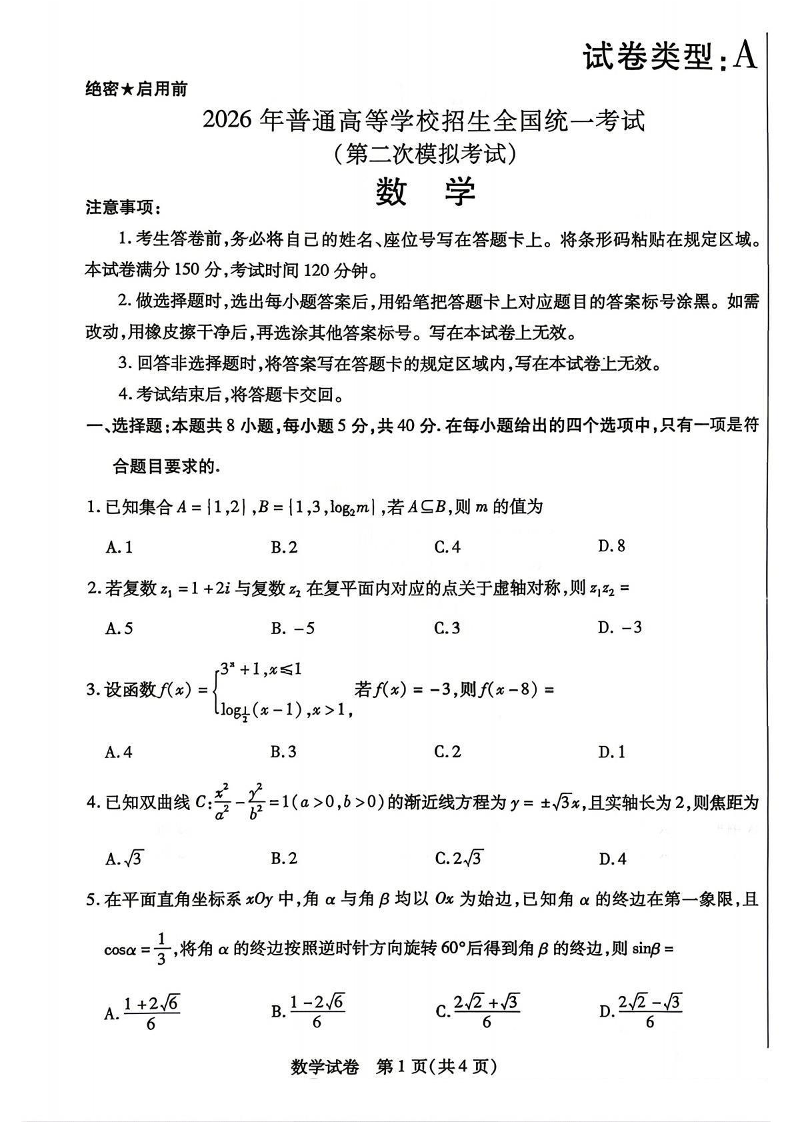 高三数学--内蒙古包头市2026届高三下学期二模考试(包头二模)