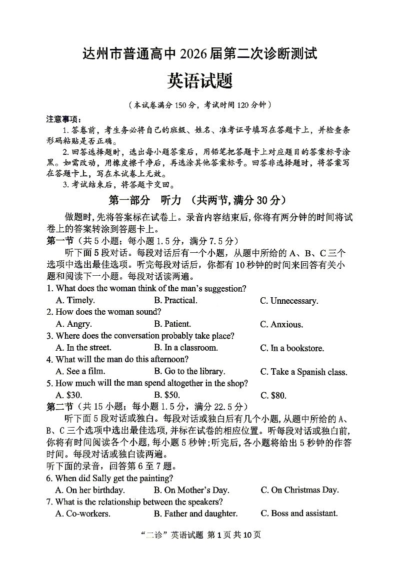 高三英语--四川省达州市2026届高三第二次诊断测试(达州二诊)