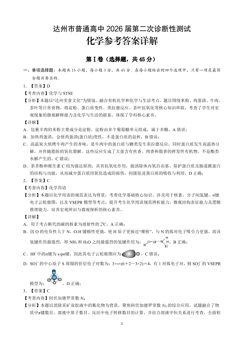 高三化学答案--四川省达州市2026届高三第二次诊断测试(达州二诊)