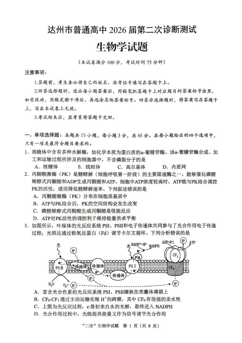 高三生物--四川省达州市2026届高三第二次诊断测试(达州二诊)