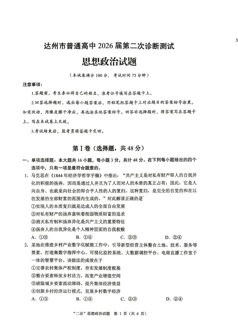 高三政治--四川省达州市2026届高三第二次诊断测试(达州二诊)