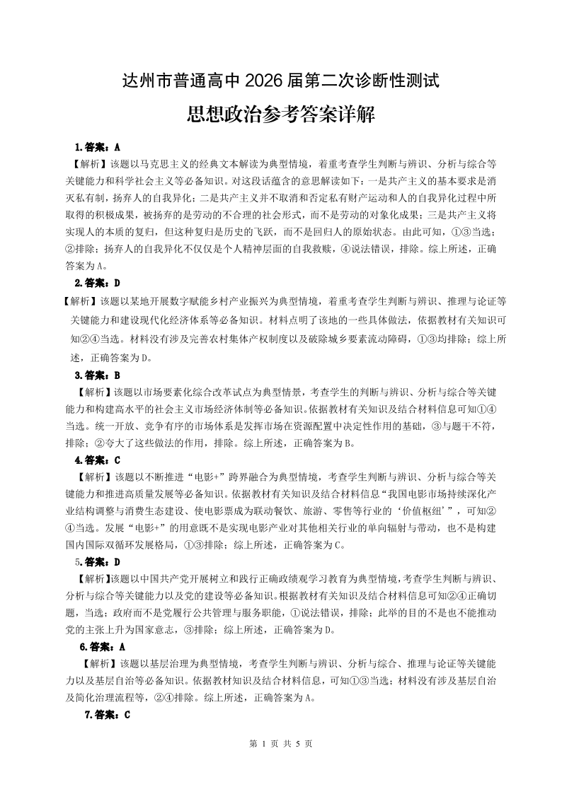 高三政治答案--四川省达州市2026届高三第二次诊断测试(达州二诊)