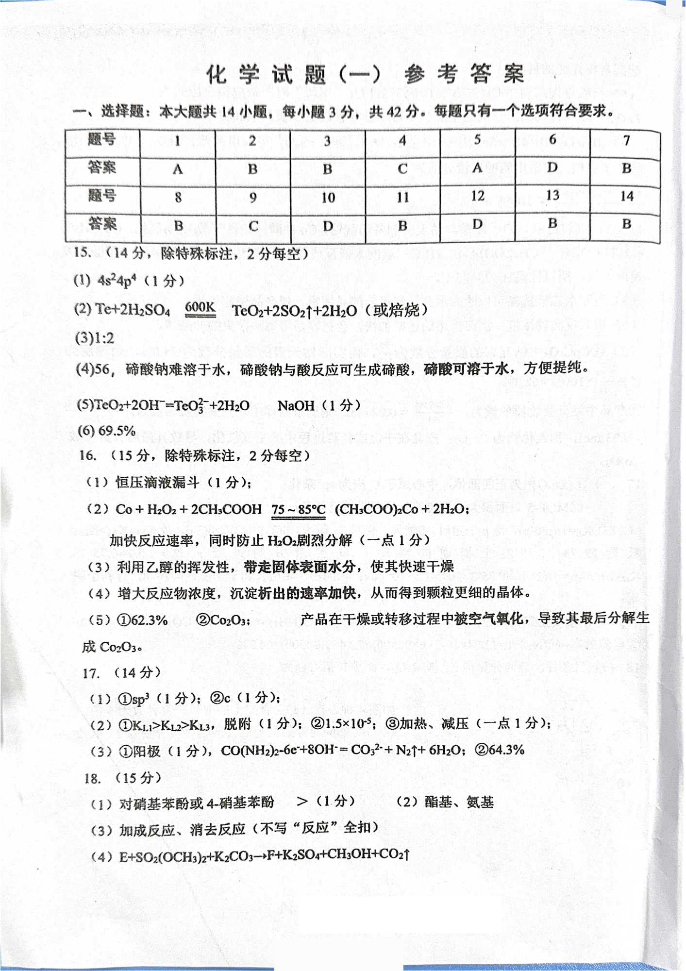 高三化学答案--重庆市第八中学2026届高三强化训练(一)