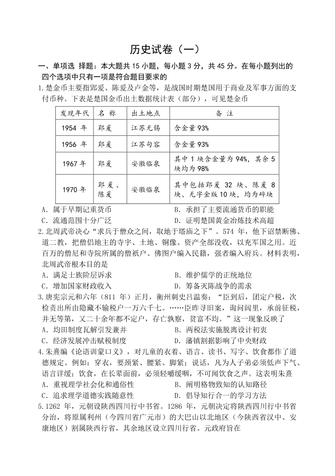 高三历史--重庆市第八中学2026届高三强化训练(一)