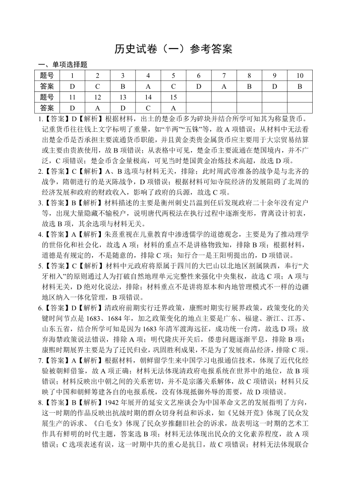 高三历史答案--重庆市第八中学2026届高三强化训练(一)