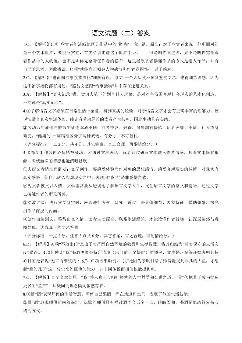 高三语文答案--重庆市第八中学2026届高三强化训练(二)