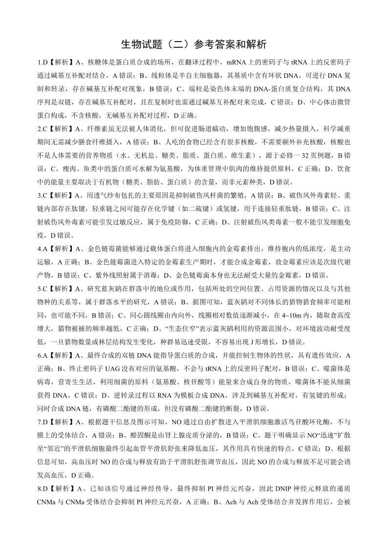 高三生物答案--重庆市第八中学2026届高三强化训练(二)
