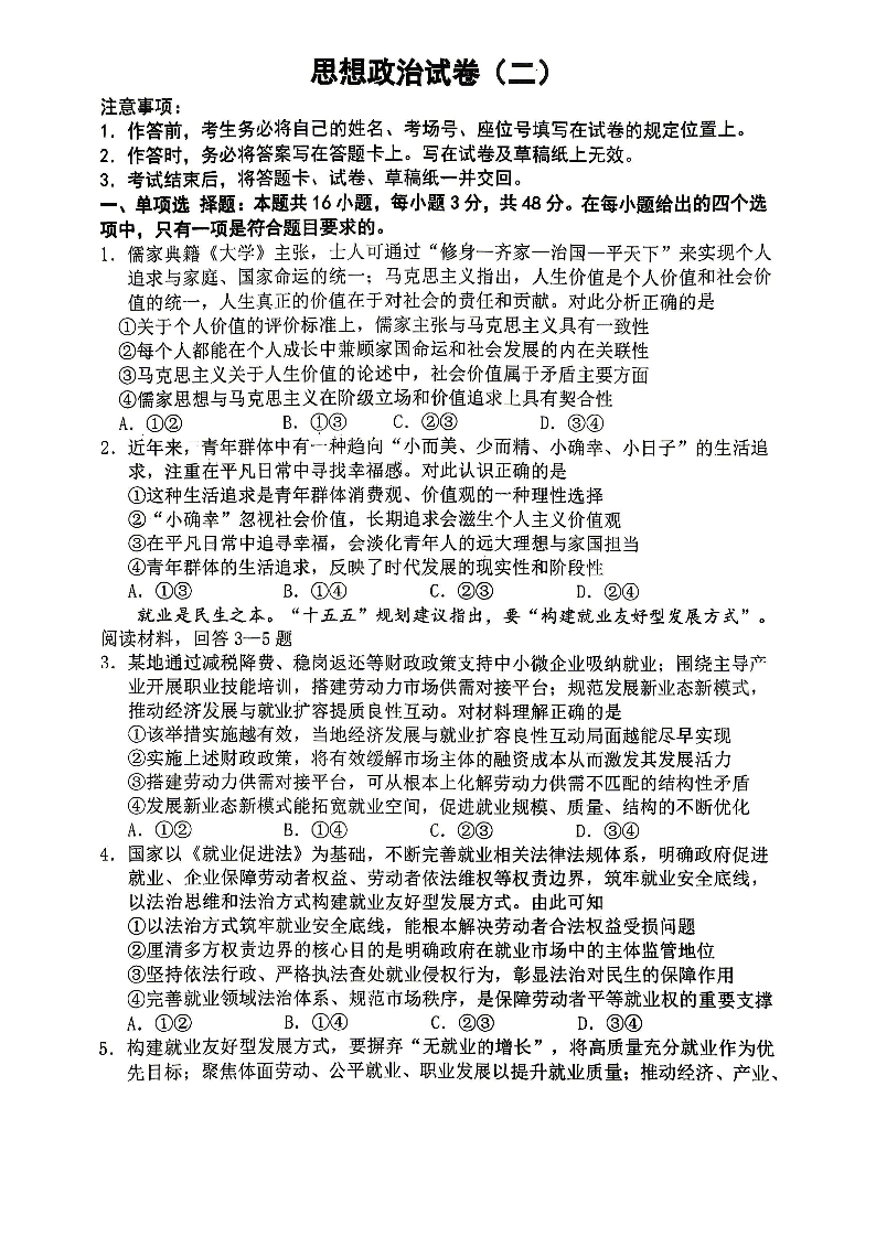 高三政治--重庆市第八中学2026届高三强化训练(二)