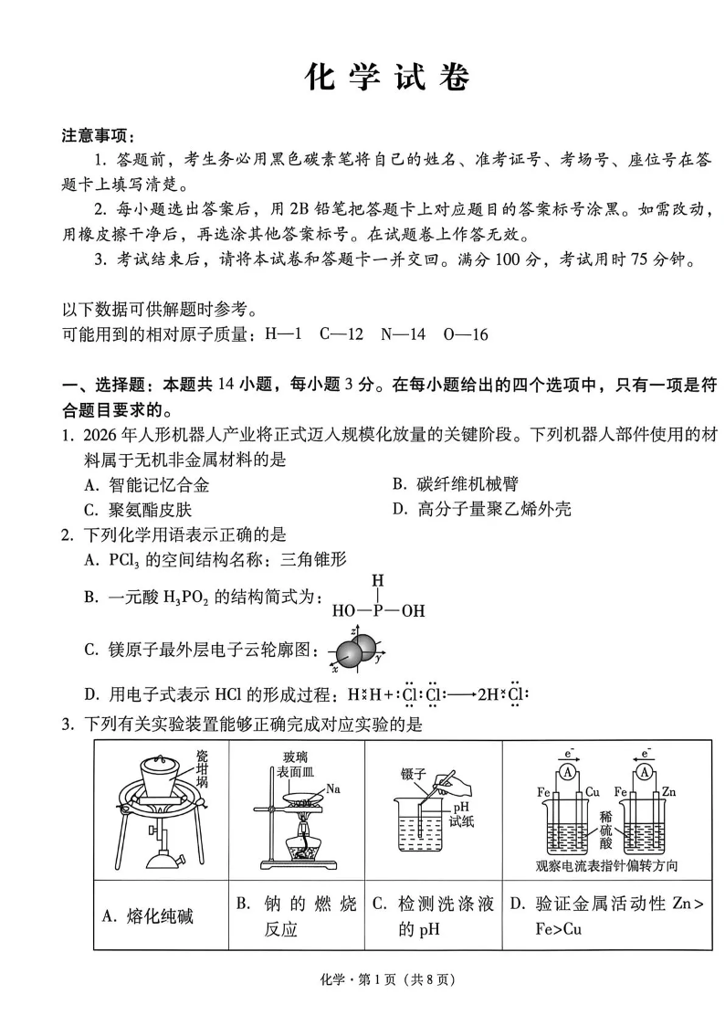 高三化学--云南省3+3+3西南名校联盟2026届高三4月联考