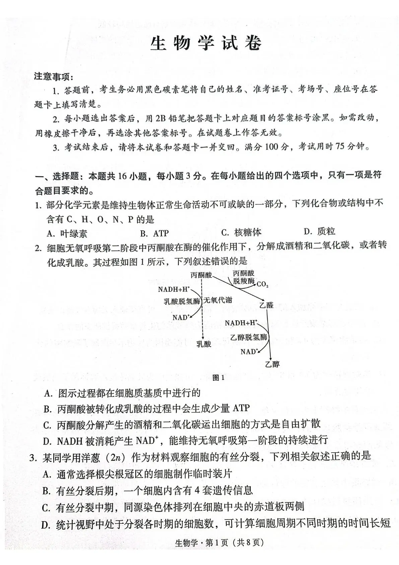 高三生物--云南省3+3+3西南名校联盟2026届高三4月联考