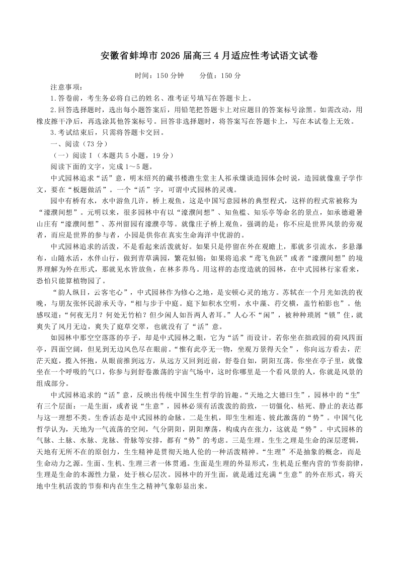 高三语文+答案--安徽省蚌埠市2026届高三下学期4月适应性考试