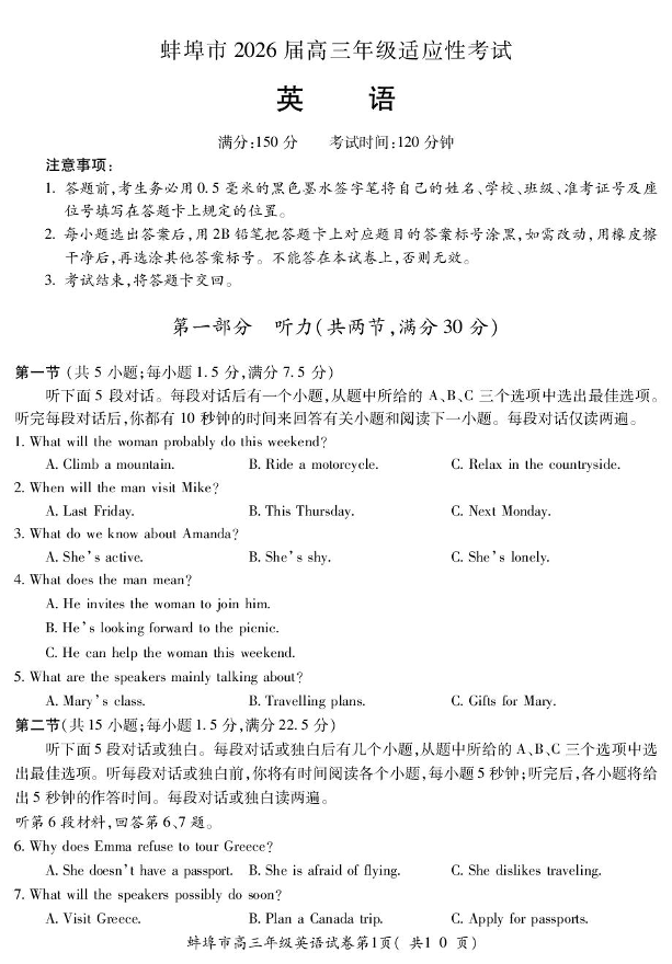 高三英语+答案--安徽省蚌埠市2026届高三下学期4月适应性考试
