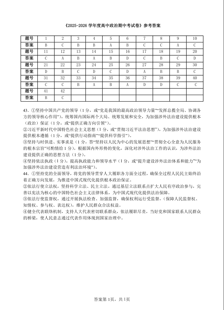 高一政治答案--广东省汕头市金山中学2025-2026学年高一下学期4月阶段性考试